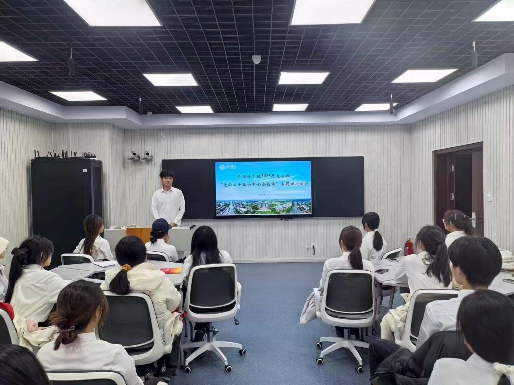 梁福顺同学带领全体学员通过读原文、析内涵的方式,深入学习《中国共产党第二十届中央委员会第四次全体会议公报》,随后,学员们分小组进行研讨。大家结合外语专业学习与志愿服务经历,分享对“青年如何在文化交流中践行党的二十届四中全会精神”“如何用专业所长讲好中国故事”等话题的思考。